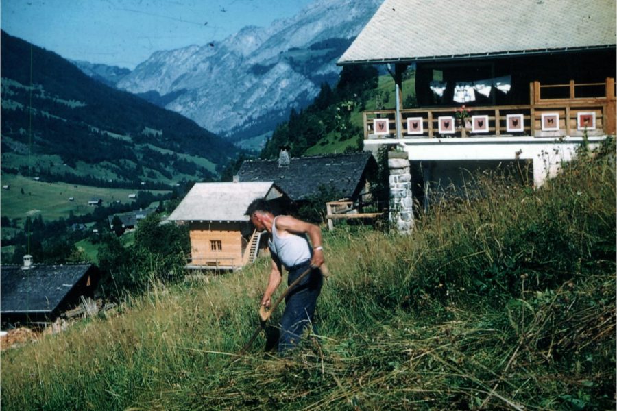 A l’époque, pas de remontées mécaniques, mais des peaux de phoque et des skis en bois, pas d’appareils photos dernière génération, mais des montages photo papier, collés a la colle blanche…la beauté de la nature, les vaches, le clocher, la douceur de vivre, c’est tout !!